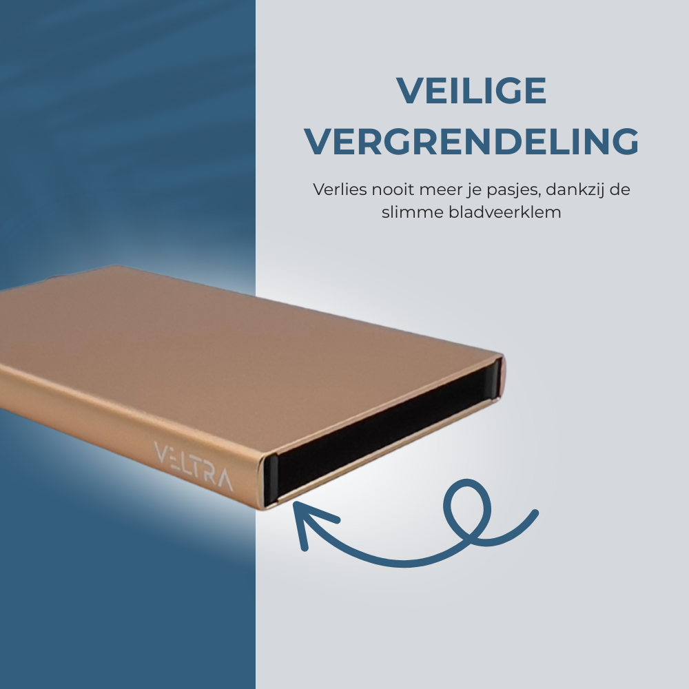De Veltra pasjeshouder gebruikt een slimme vergrendeling met duurzame bladveren aan beide kanten die je pasjes stevig vastklemmen. In tegenstelling tot houders met vilt of rubber die snel slijten en hun grip verliezen blijft deze metalen constructie jarenlang betrouwbaar zodat je pasjes nooit onbedoeld eruit glijden.